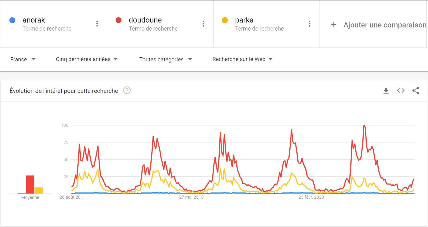 1. L’intuition : la première étape est de vous demander quels sont les mots et expressions que vos clients utilisent lorsqu’ils se renseignent sur votre entreprise. Attention toutefois au jargon qui pourrait être étranger à vos prospects. Demandez-vous également quel est le vocabulaire de votre cible. Par exemple dira-t-elle plutôt « newsletter » ou « infolettre », « pain au chocolat » ou « chocolatine », « parka » ou « doudoune » ? Vous pouvez avoir une idée des termes les plus recherchés par région et période de temps grâce à l’outil Google Trend.