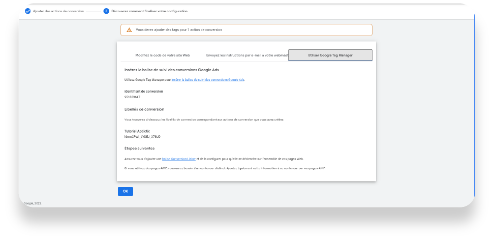 À cette étape, vous aurez besoin de copier-coller les informations de la conversion Ads dans la balise Google Tag Manager