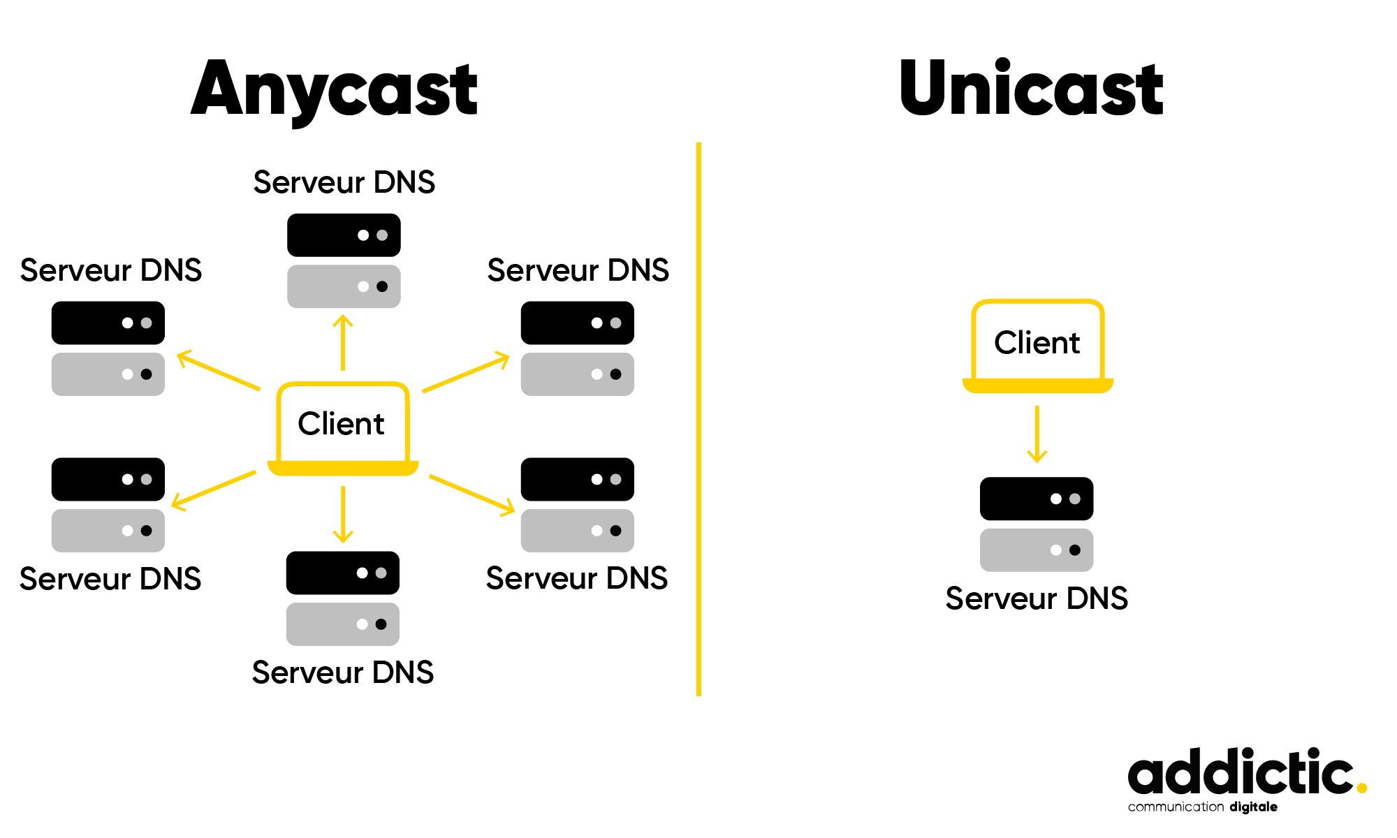 Le DNS Anycast est une technique d'adressage et de routage réseau où une seule adresse IP est attribuée à plusieurs serveurs répartis géographiquement. Contrairement au routage unicast, où une adresse IP unique pointe vers un seul serveur, le routage anycast permet à plusieurs serveurs de partager la même adresse IP. Lorsqu'une requête DNS est envoyée, elle est dirigée vers le serveur le plus proche ou le plus performant, en fonction de la topologie du réseau et de l'état actuel des serveurs.