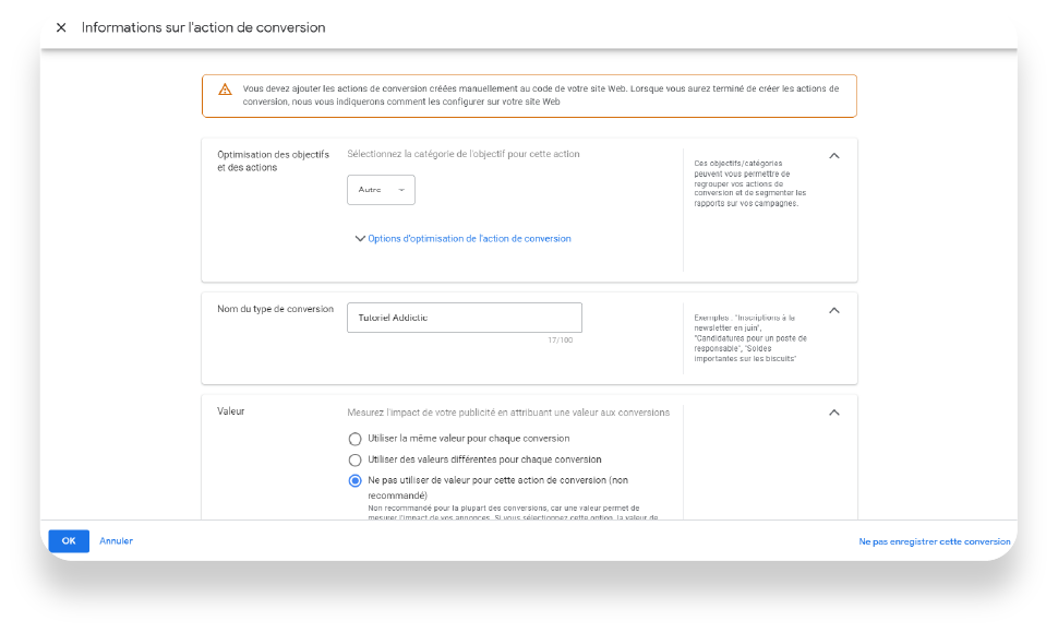 - Remplissez les informations sur la conversion à traquer, Ads offre des indications précieuses pour choisir les paramètres les plus appropriés. Puis validez en cliquant sur « OK ».
