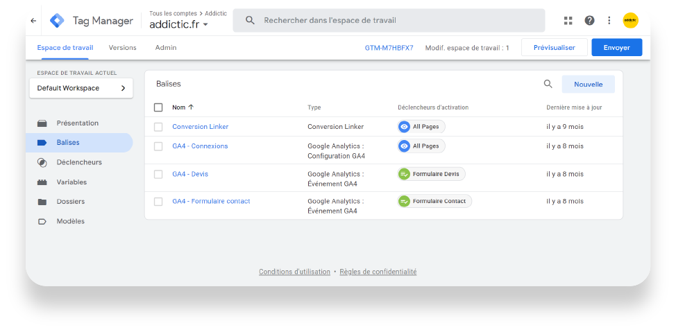 A noter qu’à cette étape, votre balise existe dans votre console Google Tag Manager mais ne sera active sur votre site qu’une fois les modifications publiées en cliquant sur le bouton « Envoyer » tout en haut à droite de la page récapitulative des balises.