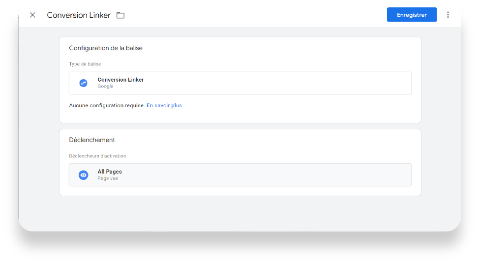 Si ce n’est pas fait, créez une première balise « Conversion Linker ». Elle permet de collecter plus facilement les données sur les clics afin de mesurer efficacement les conversions.