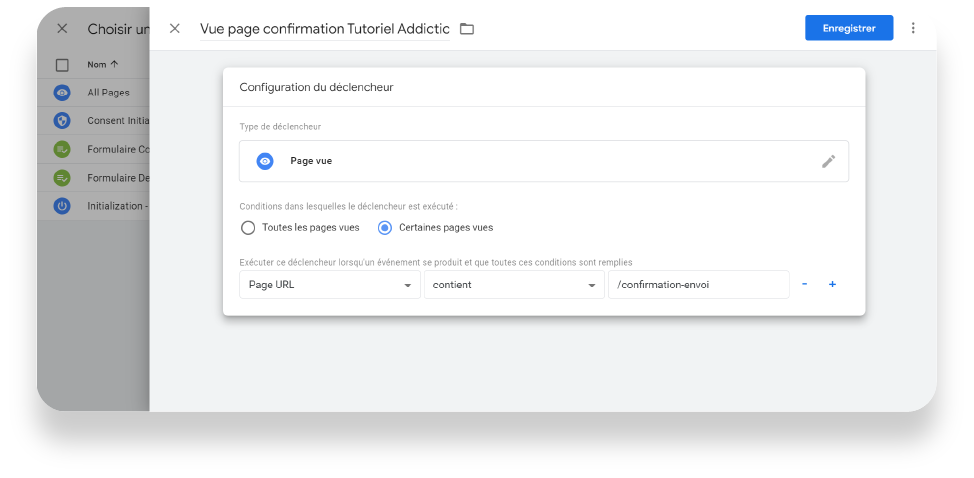 - Exemple page vue : choisissez « Certaines pages vues », dans le menu déroulant choisir « Page URL » (si Page URL n’apparaît pas, allez chercher la variable en cliquant sur « Choisir une variable intégrée ») et indiquez un élément spécifique à cette page-là uniquement : choisir « contient » dans le menu déroulant, puis taper morceau d’URL spécifique à cette page uniquement dans le dernier champs.