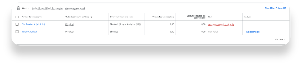 Il peut arriver que les conversions se déconnectent sans raison apparente. Nous vous recommandons de surveiller régulièrement ce tableau et de procéder au dépannage en cas de doute.