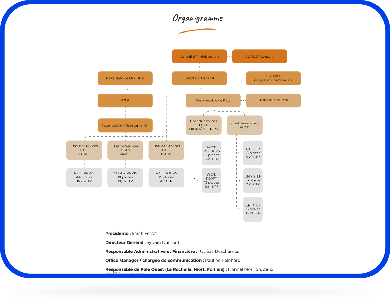 L’Association Cordia a été créée en 1991 par Pierre BOLET, dominicain, alors qu’il était Aumônier National des Artistes et du Spectacle, pour accueillir des artistes atteints du Sida. Cordia est présente dans 5 villes : Paris, Tours, Poitiers, La Rochelle, Niort et est constituée de 101 salariés.